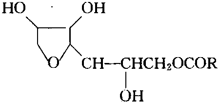 失水山梨糖醇酯的制法是,将山梨糖醇 和脂肪酸在催化剂存在下,或者在无催化剂 的高温 (200~250℃) 下进行酯化。现行的 制法,在反应中山梨糖醇发生分子内脱水,变 为失水山梨糖醇,所以得到的是1,5-失水山 梨糖醇酯[1]、1,4-失水山梨糖醇酯[2]和 山梨糖醇酯 [3]等的混合物。