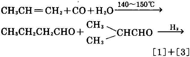 ⑥ 以丙烯、一氧化碳和水为原料,在氢化 羰基铁(或钴)为催化剂,进行雷佩(Reppe)反 应,反应在140~150℃、19.7MPa下进行。产品 为[1]和[3],再精馏分离。