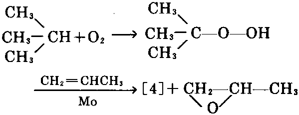 ④ 异丁烷在110℃和2.8MPa下,以空气为 氧化剂,进行氧化,生成异丁烷过氧化物,再在 钼催化剂作用下,在80~130℃和1.8~7.1MPa 下,与丙烯反应,生成[4]和环氧丙烷。