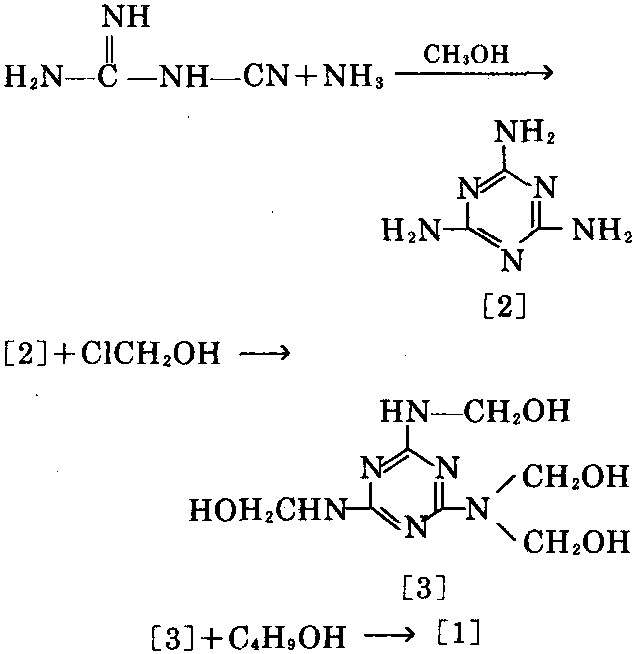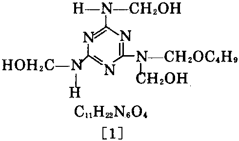 本品系多羟甲基 三聚氰胺[3]与丁醇反应(醚化)的产物。反应是 在过量丁醇存在下,在酸催化剂存在下进行的。 过量的丁醇有利于醚化反应,未反应的丁醇可 作为溶剂。改性后的丁醇醚化三聚氰胺树脂含 有一定量的丁氧基,使之可溶于有机溶剂,并能 与醇酸树脂很好地互溶。在不同的极性溶剂内 的溶解度及与不同类型的醇酸树脂的混溶性都 与丁氧基的含量有关,与醇酸树脂的混溶性还 与本树脂的缩聚度有关。在上述醛化反应中,同 时进行缩聚和醚化,缩聚是羟甲基与羟甲基间 及与未反应的活泼氢之间的反应,醚化是羟甲 基与丁醇之间的反应,这两个反应是同时进行 的,又是互相竞争的。若缩聚反应快于醚化反 应,树脂相对分子质量增大、粘度高、混溶性降 低、稳定性不良。若醚化反应快于缩聚反应时, 树脂相对分子质量减小、交联度小、粘度降低、 干性慢、硬度低。这两个反应的快慢取决于反应 系统的pH值。酸量多,pH值低,缩聚反应快于 醚化反应,对产品质量不利,树脂粘度增高,甚 至胶凝;酸量少,pH值接近中性,醚化反应快于 缩聚反应。所以可以用pH值来控制反应,既能 达到一定的缩聚度,具有高分子的优良性质,又 能有足够的丁氧基,使之有优良的溶解性、稳定 性。通常将pH值控制在4.5~6.0。作为催化剂的 酸,可用盐酸、乙酸、磷酸、油酸、草酸、氯乙酸及 邻苯二甲酸酐。双氰胺与氨在甲醇溶液中,在 200℃下反应,生成[2],[2]再与氯甲醇反应,生 成[3],[3]与丁醇反应,可制得[1]。