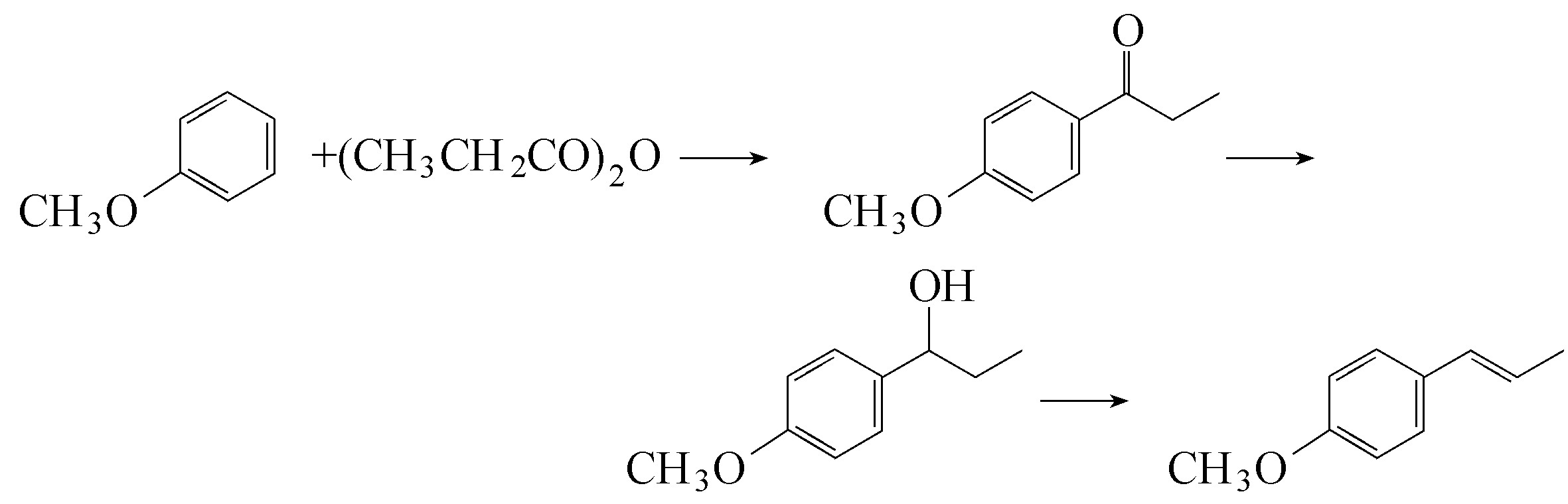 俄罗斯是使用茴香脑(苯甲醚)为原料,在氯化铁或氯化锌的存在下用丙酸酐进行酰化反应生成对甲氧基苯丙酮,继之氢化还原成醇,后者再在硫酸氢钾的存在下脱水成为大茴香脑。