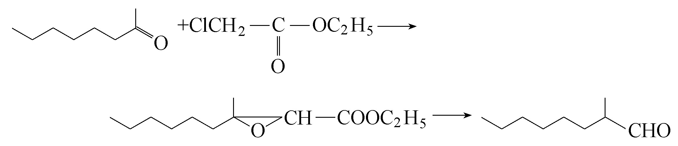 甲基己基乙醛可由甲基己基酮与一氯醋酸酯根据Darzens合成法制取。甲基己基酮和一氯醋酸酯先缩合成环氧酸酯,生成的酯经皂化、酸化成相应的环氧酸后再在酸性条件下发生脱羧重排生成羰基化合物。