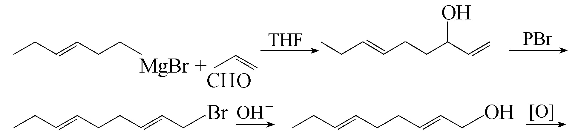 壬二烯醛的合成是以顺式-3-己烯醇(叶醇)为原料的。先将叶醇制成格氏试剂,再与丙烯醛反应生成醇,继之用溴化磷处理得到2,6-壬二烯溴,水解后转化成醇,最后经氧化生成反式-2-顺式-6-壬二烯醛。