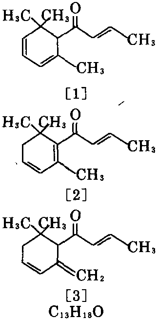 又称突厥烯 酮、(2,6,6-三甲基-1,3-环己二烯-1-基)- 2-丁烯酮、2,6,6- 三甲基-反-1 - 巴豆酰基-1,3-环 己二烯。有3种异构 体,即α-大马烯酮 [1]、β-大马烯 酮[2]、γ-大马烯 酮[3]。通常所指系 [2]。[2]在三者中 最早被发现,也是 研究较多者。1970 年在保加利亚的玫 瑰油中发现了[2], 成为香料新物种之 一。无色至浅黄色 油状液体。有浓郁 的玫瑰样香气,即 使含量低于0.01%,亦可嗅得其香气。相对分子 质量190.28。相对密度0.942。沸点 116~118℃(1.733×103Pa)、57℃(0.133Pa)。折 射率1.5123。