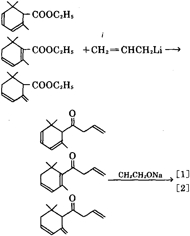 ⑧以相应的藏花酸(α-,β-或γ-)乙酯 为原料,用烯丙基锂处理,生成相应的2,6,6-三 甲基-丁烯酰基己二烯,在乙醇钠中加热催化 异构化,可制得[1]和[2]的混合物。