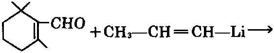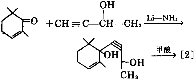②以三甲基环己烯酮为原料,与丁炔醇在 锂催化剂(氨基锂)作用下炔化(Arens-Van Dorp反应),再与甲酸作用,可制得[2]。