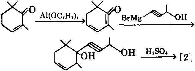 ③ 以三甲基环己烯酮为原料,与丙氧基铝 反应,分子重排,再与格氏试剂反应,进行炔化, 最后与35%的硫酸作用,可制得[2]。