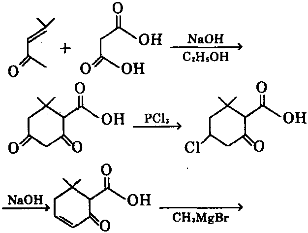 ④以甲基戊烯酮和丙二酸为原料,在氢氧 化钠的乙醇溶液中进行反应,生成环己二酮,与 三氯化磷反应,进行氯氧化,生成环己酮,在碱 溶液中脱氯,生成环己烯酮,再与格氏试剂反 应,进一步烷基化及分子重排,可制得[3]。