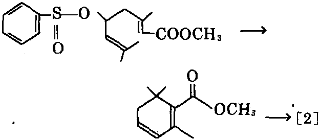 ⑦以苯磺酰异戊-2-烯和溴代异丁烯酸 甲酯为原料,在丁基锂作用下,反应,在硫酸和 乙酸中,在丁醇钾作用下,水解脱苯磺酰基,生 成2,6,6-三甲基-1,3-环己二烯-1-羧酸甲 酯,在丙烯锂作用下异构化,可制得[2]。