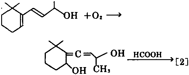 ⑧以7,8-脱氢-β-紫罗兰醇为原料,在 光照下氧化,生成不饱和二醇,再用80%的甲酸 处理,可制得[2]。