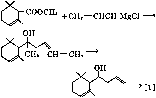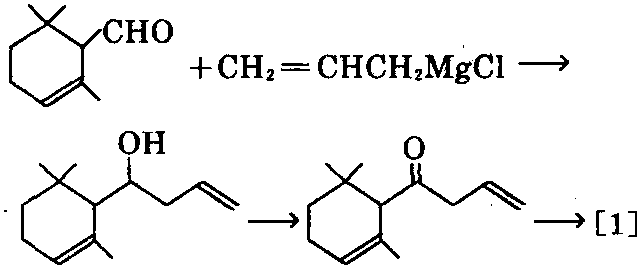 ④以2,6,6-三甲基环己-2-烯基甲酸甲 酯为原料,与烯丙基格氏试剂反应,生成2,6,6- 三甲基-1-(4-羟基-1,6-庚二烯基)环己- 2-烯,在二甲基甲酰胺溶液中,在叔丁醇钾的 作用下,异构化,裂解,可制得[1]。