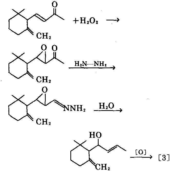 ⑨以γ-紫罗兰酮为原料,用过氧化氢氧 化,生成环氧酮,再与肼作用,生成丙烯基醇,进 一步氧化,可制得[3]。