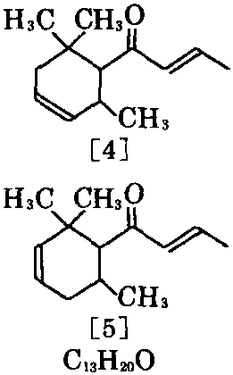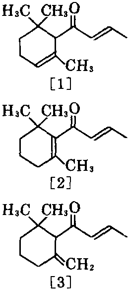 又称突厥酮、 2,6,6-三甲基-1-巴豆 酰基环己烯。有3种异构 体,即α-体[1]、β- 体 [ 2 ] 、γ - 体 [3],此外,尚存在δ-体 [4]及ε-体[5]。相对分 子质量176.30。市售品 为α-、β-、γ-的混合 物。天然品存在于玫瑰 油、茶叶、烟叶中,且多 为β-体。关于[4]、[5] 的报道甚少。