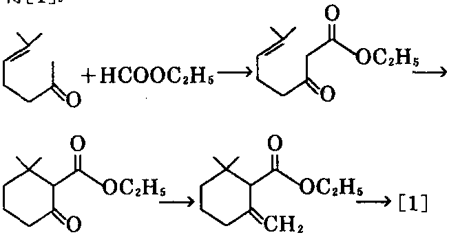 ⑦以6-甲基-5-庚烯-2-酮为原料, 在醇钠的碱溶液中与碳酸乙酯反应,缩合,失去 一分子的醇,生成β-酮酯,再在酸催化剂作用 下环合,再与亚甲基三苯磷作用,使2-位酮基 变为亚甲基,最后与丙烯基格氏试剂反应,可制 得[1]。