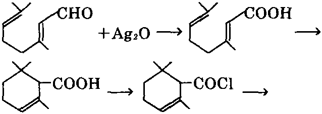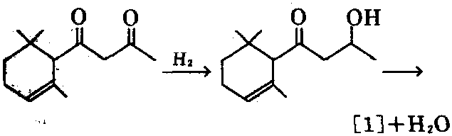 ② 以柠檬醛为原料,以氧化银为催化剂, 氧化生成柠檬酸,加氢闭环,生成环己基羧酸, 与氯化氢作用,生成2,6,6-三甲基-1-甲酰氯 环己烯,与丙酮反应,生成丁二酮基环己烯,在 催化剂作用下加氢(或用铁粉还原),最后脱水, 可制得[1]。