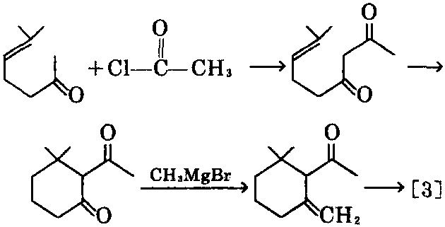 ⑥ 以6-甲基-5-庚烯-2-酮为原料, 与乙酰氯反应,生成壬二酮,在酸催化剂作用下 闭环,生成1-乙酰基-6,6-二甲基环己-2- 酮,进一步与甲基格氏试剂反应,生成2-亚甲 基-6,6-二甲基-1-乙酰基环己烷,与氯乙 烯反应,最后在叔丁醇钾作用下异构化,可制得 [3]。