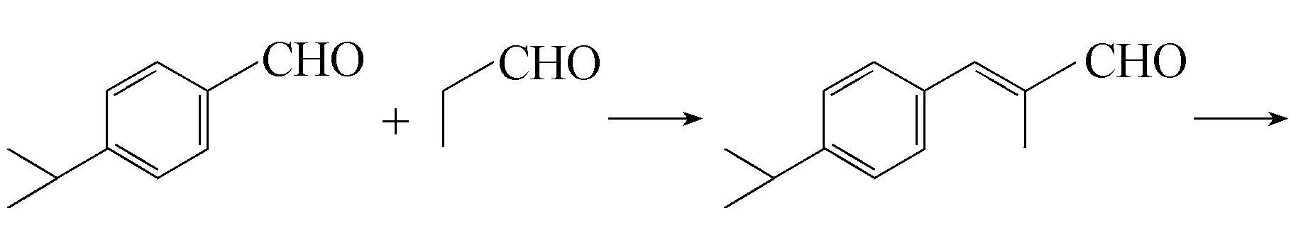 兔耳草醛的合成路线较多。但通常使用较多的方法是以枯茗醛为原料,先与丙醛缩合成前兔耳草醛,然后再将这一不饱和醛选择性地氢化成为兔耳草醛。