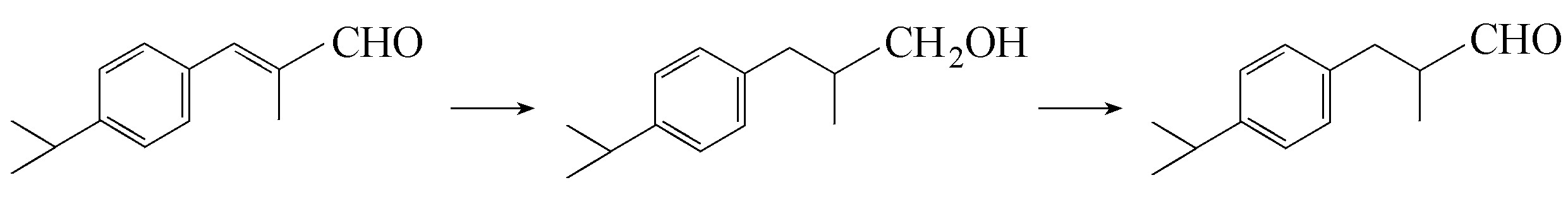 由于上述工艺方法的氢化反应不可能做到绝对的选择性,因而在最终产品中会含有微量的不饱和的前兔耳草醛,从而影响了兔耳草醛的香气质量。在实际生产中,常常是将前兔耳草醛氢化成为兔耳草醇,然后再将兔耳草醇脱氢成为兔耳草醛。这样就能消除不饱和醛的存在,确保产品的香气质量。