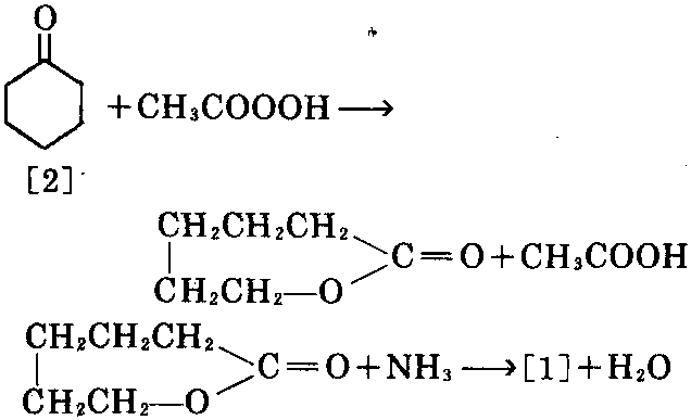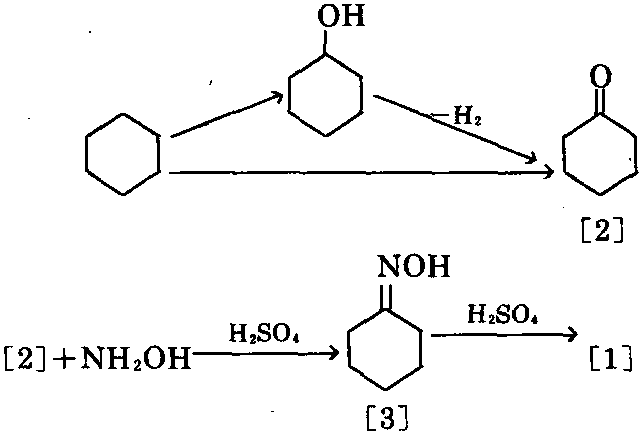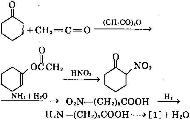 ⑨ 以环己酮和乙烯酮为原料,在过量醋酸 酐存在、在140℃下进行反应,生成环己烯基乙 酸酯,再与硝酸在30~50℃下反应,生成2-硝 基环己酮,取出2-硝基环己酮,用水稀释,在 40~60℃通入氨,进行氨解,生成ε-硝基己酸, 在100℃及2MPa下,在镍催化剂作用下加氢, 生成氨基己酸,在300℃及10MPa下氨基己酸 环化,可生成[1]。