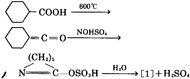 ④苯胺法。以苯胺为原料,在镍催化剂作 用下,加压加氢,生成环己胺,再在钴催化剂作 用下,用空气氧化,生成[3],在浓硫酸中进行贝 克曼分子重排,可制得[1]。