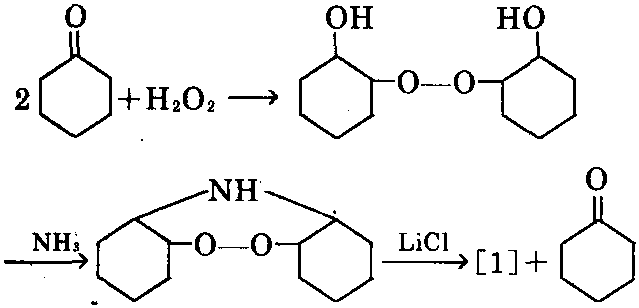 ⑧以环己酮为原料,在乙醇溶液中与过氧 化氢反应,生成1,1′-二羟基二环己基过氧化 氢,再在24~25℃下进行氨解,生成1,1′-过氧 二环己基胺,在氯化锂作用下生成[1]及环 己酮。