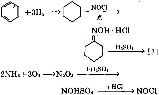 ② 光亚硝化法。又称PNC法,系日本东洋 人造丝公司开发,是工业较早采用光化学反应 来生产己内酰胺的方法。以苯为原料,在镍催化 剂作用下加氢,生成环己烷,环己烷与氯化亚硝 酰在盐酸中,在高压汞灯照射下生成环己酮肟 盐酸盐,环己酮肟盐酸盐在浓硫酸存在下,进行 贝克曼重排,生成粗制[1],用氨中和,再用三氯 乙烯萃取,然后精馏、重结晶精制。此法与①法 不同之处在于制备酮肟时,不采用价格昂贵的 羟胺,而采用廉价的氯化亚硝酰,并采用光化学 反应制备酮肟,工艺简单、原料较廉。
