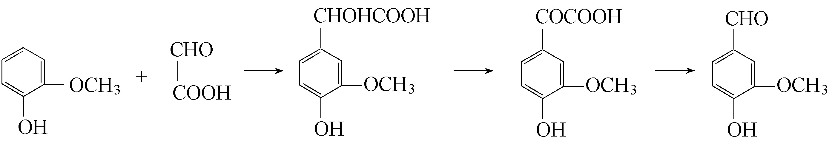 以愈创木酚和乙醛酸为原料,经缩合、氧化、脱羧制成香兰素。