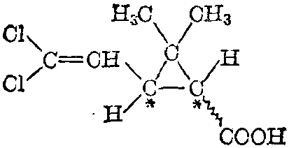 简 称“DV酸”。学名“2,2-二甲基-3-(2,2- 二氯乙烯基)-环丙烷羧酸”。分子式C8 H10O2Cl2。分子量209.07。分子结构中有 两个手征性碳原子,故有两种外消旋体(反 式、顺式)和四种光学异构体(d-反式、l-反 式、d-顺式和l-顺式)。 各种二氯菊酸的 物性如下: