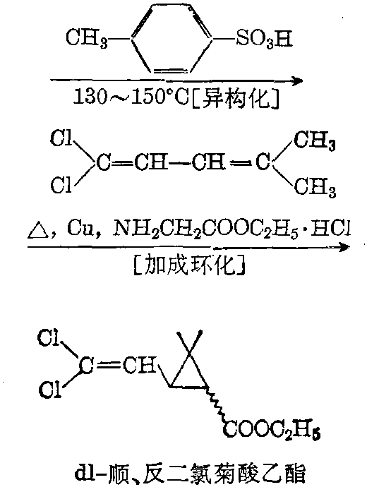 导读:二氯菊酸 : 简称“DV酸”。学名“2,2-二甲基-3-(2,2-二氯乙烯基)-环丙烷羧酸”。分子式C8H10O2Cl2。分子量209.07。分子结构中有两个手征性碳原子,故有两种外消旋体(反式、顺式)和四种光学异构体(d-反式、l-反式、d-顺式和l-顺式)。 各种二氯菊酸的物性如下:二氯菊酸熔点℃比 旋 光 度dl-反式dl-顺式84~87℃94~97℃ d-反