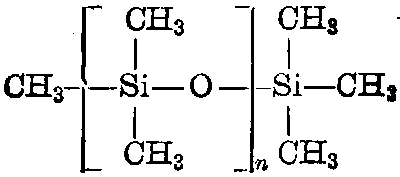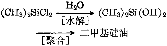 亦称“二甲硅酮”。二甲基硅氧烷的 聚合物,n平均值为200~350。无色澄清 油状液体。无臭,无味。比重0.965~ 0.975(25/4℃)。折光率1.4000~1.4100。 粘度约为6×10-9米2/秒(25℃)。与氯仿、 乙醚、苯、甲苯、二甲苯互溶,不溶于水、乙 醇。可由二甲基二氯硅烷经水解、聚合制 得:
