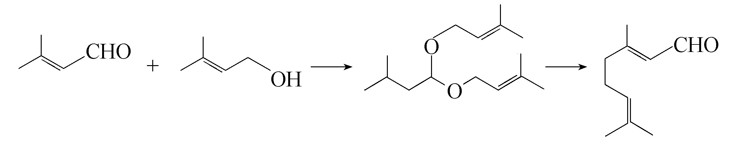 由异戊烯醛和异戊烯醇先反应生成缩醛,再将缩醛重排成为柠檬醛的合成方法,被认为是生产上最可接受的工艺路线(德国专利2926562;法国专利2656604)。