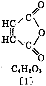 又称顺 丁烯二酸酐、2,5-呋喃二酮、 失水苹果酸酐。1817年首次制 得。本品为顺丁烯二酸分子内 失去一分子水而形成的酸酐。 从氯仿中析出者为无色斜方晶 系针状结晶。相对分子质量 98.06。相对密度1.480、1.314 (60℃)。熔点60℃。沸点202℃、 179.5℃(53.329×103Pa)、155.9℃(26.664×103 Pa)、135.8℃(13.332×103Pa)、122.0℃(7.999× 103Pa)、111.8℃(5.333×103Pa)、95.0℃(2.666× 103Pa)、78.7℃(1.333×103Pa)、63.4℃(0.667× 103Pa)。闪点110℃。燃点447℃。溶于水,生成失 水苹果酸,溶于醇生成酯。溶于丙酮(25℃时227 g/100g)、乙酸乙酯(25℃,下同)112、氯仿52.5、 苯50、甲苯23.4、邻二甲苯19.4、四氯化碳0.6、二烷。本品的碳-碳双键与两个羰基相连,性质 非常活泼,并且是缺电子性的烯烃,很容易进行 亲核反应,与醇、胺、腈、硫脲、环己烷、亚磺酸有 机金属化合物等发生加成反应;它又是烯烃,在 适当的条件下,也能进行烯烃的亲电加成反应; 也能与其他共轭双烯进行Diels-Alder反应, 形成环己烯化合物;也能自聚及共聚;在催化剂 作用下,能发生异构化反应;在过渡金属催化剂 作用下,能发生分解及脱羧反应;在铁催化剂作 用下,与光气反应,生成二氯异丁烯内酯。本品 对皮肤、眼睛、粘膜有刺激性,可引起炎症。大鼠 经口LD50400~850mg/kg。工作场所最高允许 浓度0.25×10-6。