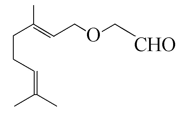 香叶氧基乙醛有新鲜的醛香香气,玫瑰和兔耳草似的香韵。外观为液体,沸点108℃/1.6kPa。为反式和顺式异构体混合物,d204~0.902,n20D~1.471。