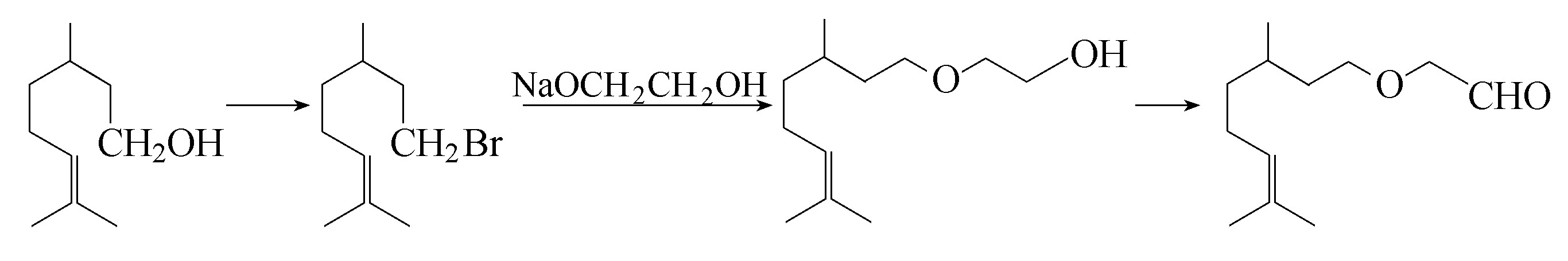 另有一个制法是,仍以香茅醇为原料,先进行溴代,然后再与乙二醇单钠反应脱去溴化钠,最后再将生成的香茅氧基乙醇氧化便得到香茅氧基乙醛。
