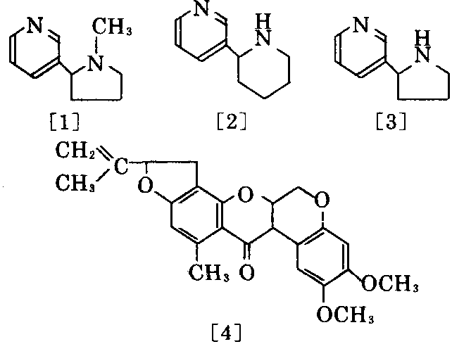 系指 直接从天然物质中提取的杀虫剂。早在1828年 已从烟叶蒸馏中得到烟碱(尼古丁)[1]。其他如 除虫菊素 (Pynothrin)、灭虫碱 (Ansoasine- )[2]、降烟碱(Nornictine)[3]、鱼藤酮(Rotenone)[4]等也具有很强的灭虫活性。但从它们的 天然产量来看,只有烟碱具有实用价值。烟碱主 要以其硫酸盐水溶液形式使用,也可以气态形 式使用,在昆虫体内不分解,长期保持兴奋,使 昆虫致死。采用合成法制造的烟碱用作杀虫剂, 已得到普遍采用。在南亚、中南美洲发现鱼藤酮 亦可用作杀虫剂,这种毒剂经呼吸系统使昆虫 致死,与除虫菊相比,具有迟效性、杀虫作用较 弱,效果较差。1932年发现了[4]的化学结 构,1958年合成了[4],其后又合成了它的衍生 物,但作为杀虫剂来说,远未达到理想的效果。