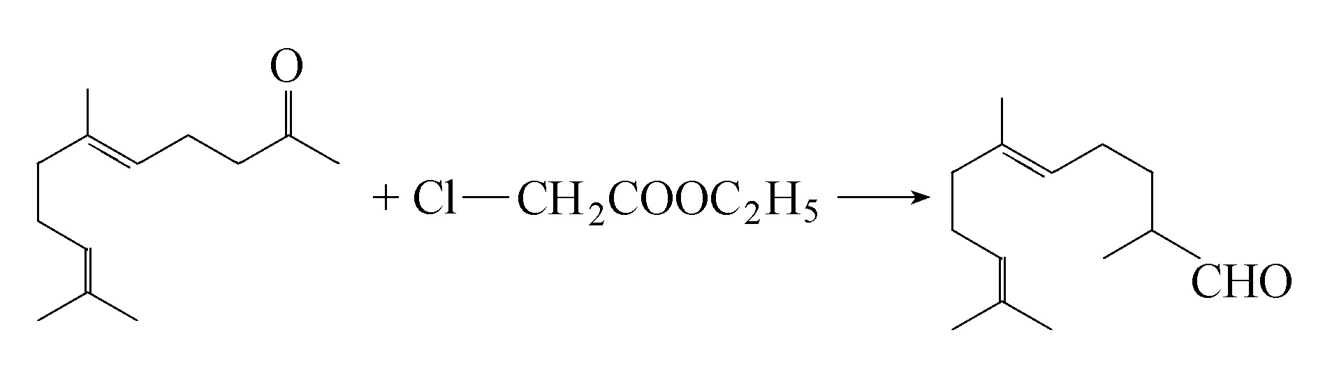 前金合欢醛可由香叶基丙酮和一氯醋酸乙酯为原料,经Darzens反应制得。反应过程是先生成环氧酸酯,然后皂化、酸化成相应的环氧酸,最后再在酸性条件下发生脱羧重排生成羰基化合物[Укр.хим.журн.1962,28(1),84;Riechstoffe,Aromen,körperpfl,1969,19(4),156]。