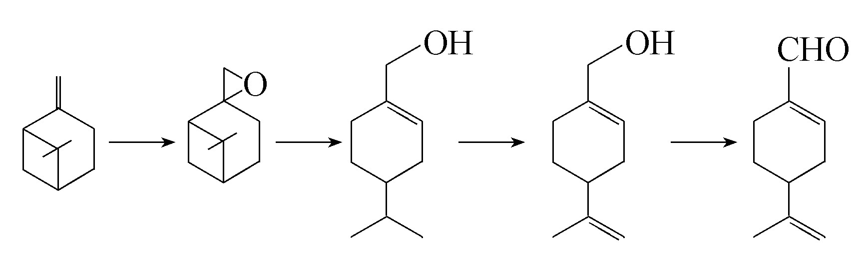 全合成法则可以β -蒎烯为原料,先进行环氧化生成环氧蒎烷,再氢化、异构化转变成为水芹醇,继之再脱氢成为紫苏醇,氧化后即成为紫苏醛。