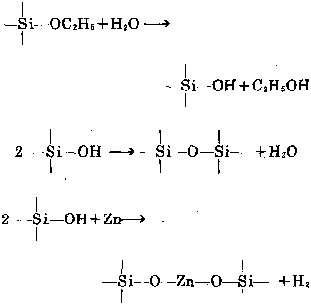 ②硅酸烷基酯系富锌涂料。由硅酸烷基酯的醇 溶液与锌粉组 成。作为硅酸 烷基酯以相对 分子质量为 750、SiO2含量 约40%的硅酸 乙酯居多。硅酸乙酯的化学结构如[1] (n=4~5)。固化反应如下: