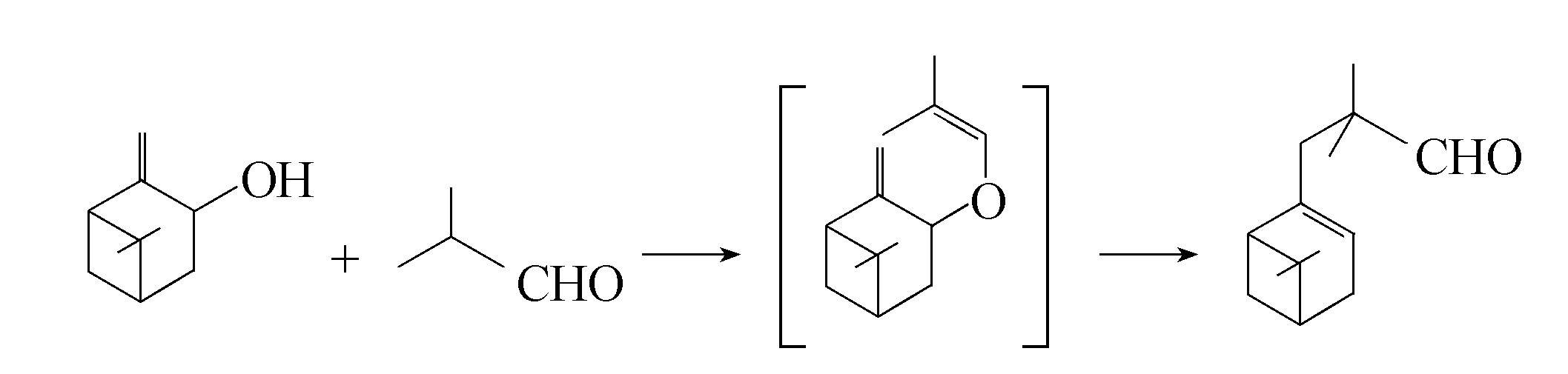 由松香芹醇与异丁醛缩合,生成的中间产物经过Claisen重排而得到松异丁醛(日本专利1977-35668)。