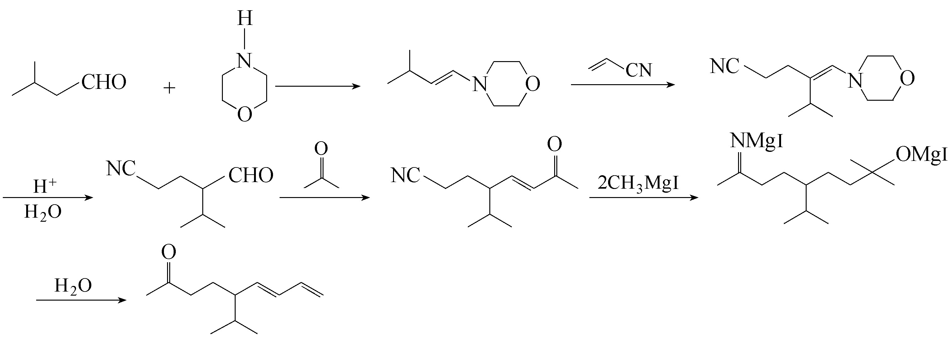 茄酮的合成路线很多,但大多数都是以异戊醛为起始原料进行合成的。我国李德俊等人用异戊醛和吗啉为原料,经多步反应制得茄酮。