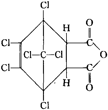反应型阻燃剂 : 反应型阻燃剂包括2,3-二溴丙醇、二溴苯 酚、三溴苯酚、五溴苯酚、四溴双酚A、四 溴邻苯二甲酸酐、四氯双酚A、四氯邻苯二 甲酸酐、1,4,5,6,7,7-六氯双环[2,2, 1]-5-庚烯-2,3-二羧酸酐、1,4,5,6,7, 7-六氯双环- [2,2,1 ]-5-庚烯-2,3-二羧酸、 双 (2,3-二溴丙基) 反丁烯二酸酯、O,O- 二乙基-N,N-双(2-羟基乙基)氨甲基膦酸 酯、二 (聚氧亚乙基) 羟甲基膦酸酯、缩水 甘油二溴甲苯基醚、三溴新戊醇、丙烯酸二 溴丙酯、3-溴-1,2-环氧丙烷、2,2′-[异亚 丙基双(2,6-二氯对酚氧基)]聚环氧丙烷二 醇、三溴苯基烯丙基醚、四溴双酚A烯丙基 醚等。如1,4,5,6,7,7-六氯双环[2,2, 1]-5-庚烯-2,3-二羧酸酐[1,4,5,6,7, 7-hexachlorobicyclo (2,2,1)-5-heptene-2, 3-dicarboxylic anhydride],又名氯桥酸酐或 六氯桥甲撑四氢邻苯二甲酸酐。其结构式为: