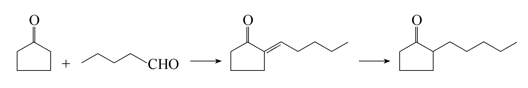 戊基环戊酮可由环戊酮和正戊醛为原料,先经过羟醛缩合再脱水生成亚戊基环戊酮,继之再进行选择性催化氢化制得。