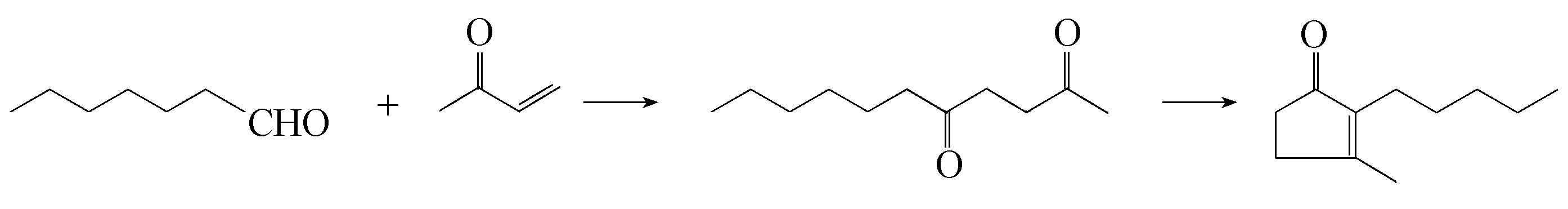 以庚醛和甲基乙烯基酮为原料,先缩合生成十一烷-2,5-二酮,再进行分子内缩合环化而生成二氢茉莉酮(Tetrahedron Lett.1974,№51~52,4505)。