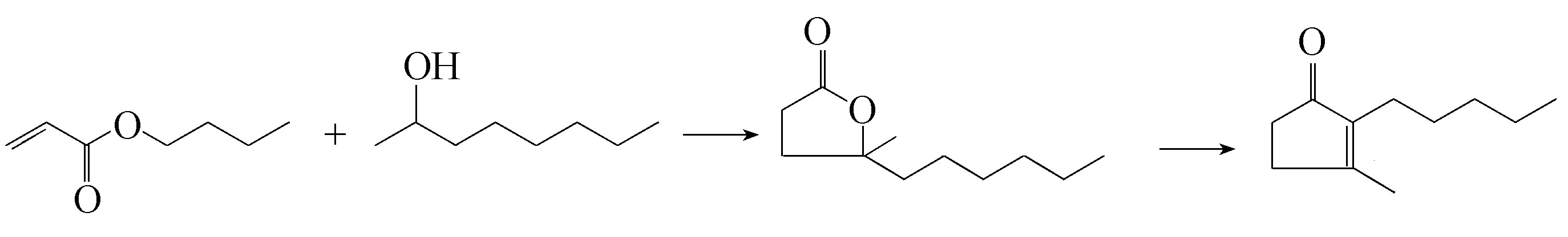 以丙烯酸酯和2-辛醇为原料,先进行游离基加成反应生成甲基癸内酯,继之在多聚磷酸存在下进行脱水、分子重排得到二氢茉莉酮。