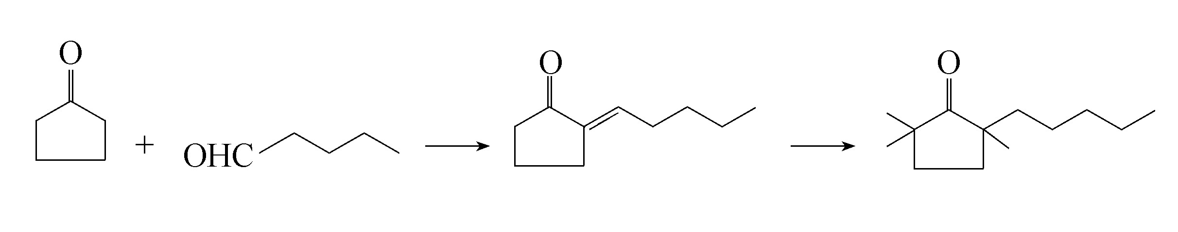 以环戊酮为起始原料,先与正戊醛进行羟醛缩合,脱水后生成亚戊基环戊酮,再经甲基化反应制得三甲基戊基环戊酮。