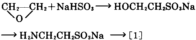 ② 以环氧乙烷和亚硫酸氢钠为原料,在 70℃下反应生成2-羟基乙磺酸钠,进一步氨解 及脱盐,可制得[1]。