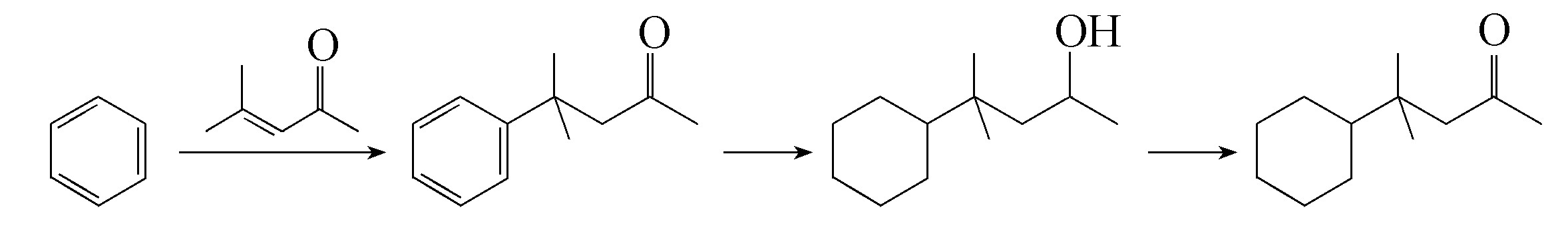 工业上岩兰草香酮是由苯和异丙叉丙酮为原料制成的。先在三氯化铝催化剂存在下,由苯和异丙叉丙酮进行缩合,缩合产物再在骨架镍的存在下进行氢化,最后用铜铬催化剂脱氢或是用红矾硫酸液氧化而生成岩兰草香酮。