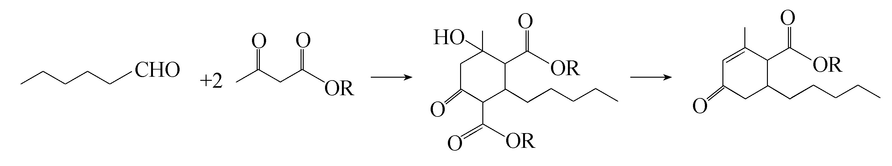 卡莉莎酮可由己醛和乙酰乙酸酯在叔胺的存在下进行缩合,继之再脱水和脱羧制得(德国专利2654840)。