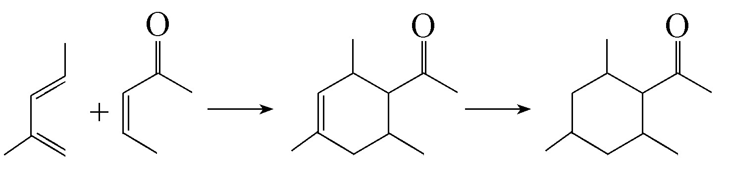 三甲基环己基甲酮可由2-甲基-1,3-戊二烯同3-戊烯-2-酮进行双烯加成,然后再经选择性催化氢化而得。