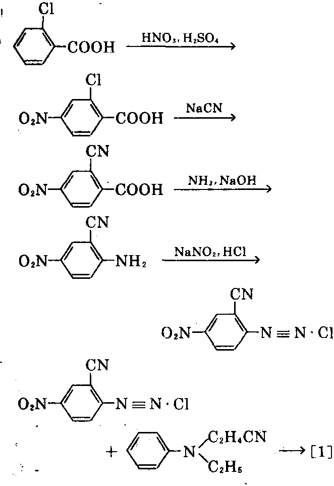 制法: 以邻氯苯甲酸为原料,用混酸进行 硝化,再用氰化钠氰化,在碱性溶液中氨解,再 在盐酸溶液中与亚硝酸钠进行反应,重氮化,再 与N-乙基-N-乙腈苯胺进行偶合,可制 得[1]。
